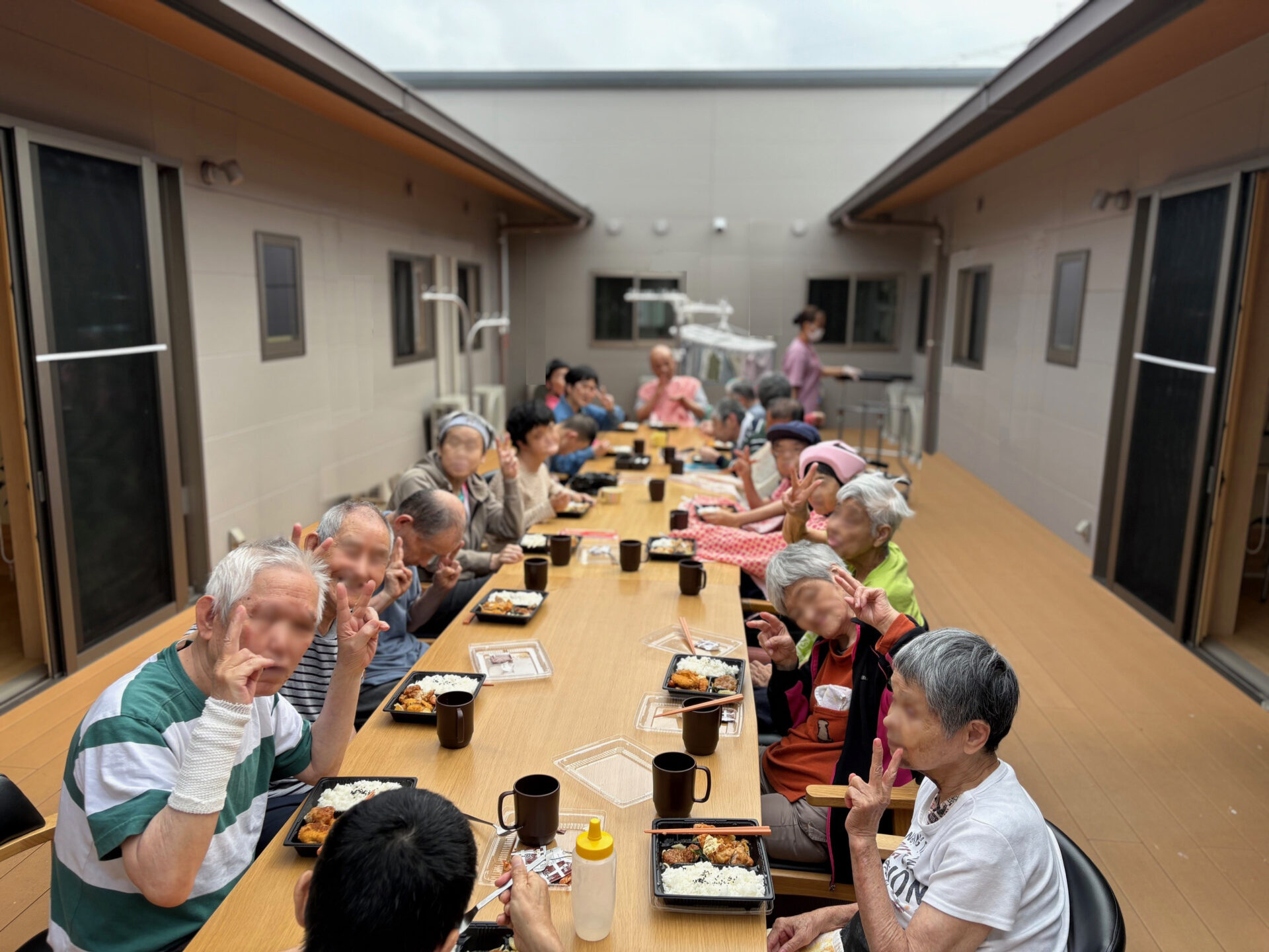 重度で多動のご利用者さんは中庭の光があたる場所がお気に入りで過ごしています。他にも、以前は個室に引きこもりがちだった方が、今は食堂によく出てきてくれるようになりました。その方は食堂の居心地が良いのだと思います。