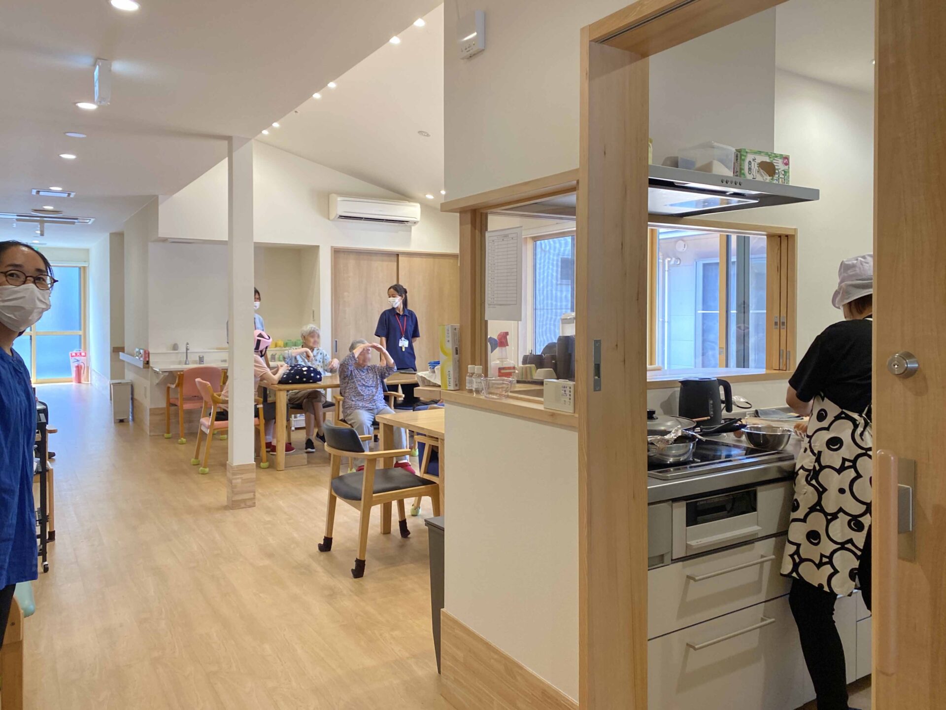 食堂と隣接している対面キッチンでは、スタッフがなるべく窓を開放して料理をしてくれていて、ご利用者さんたちに好評です。