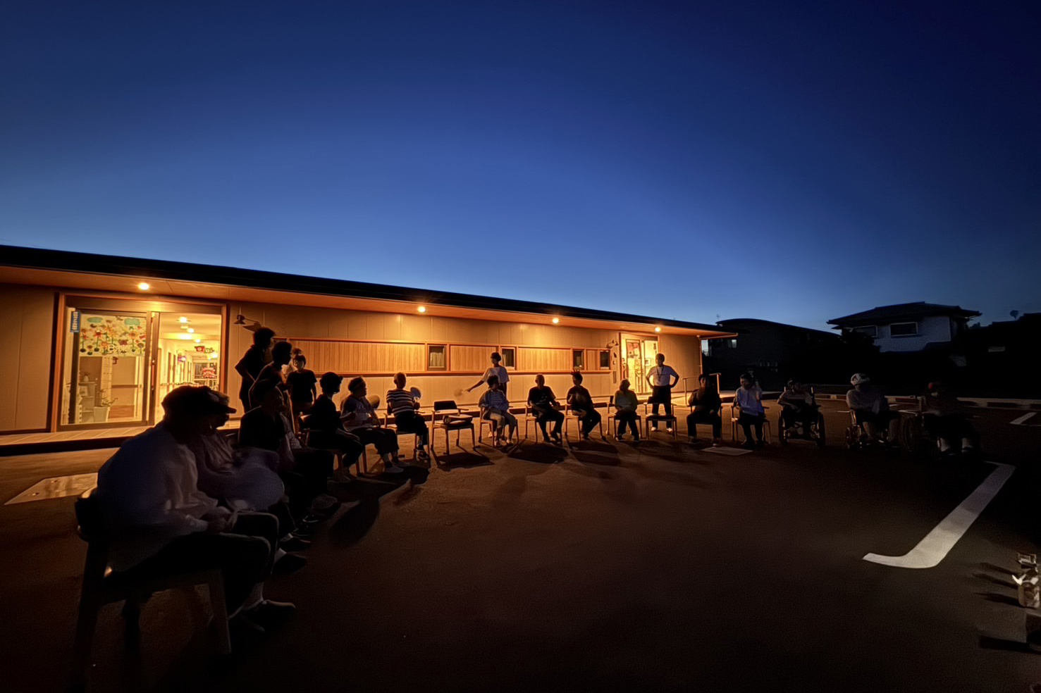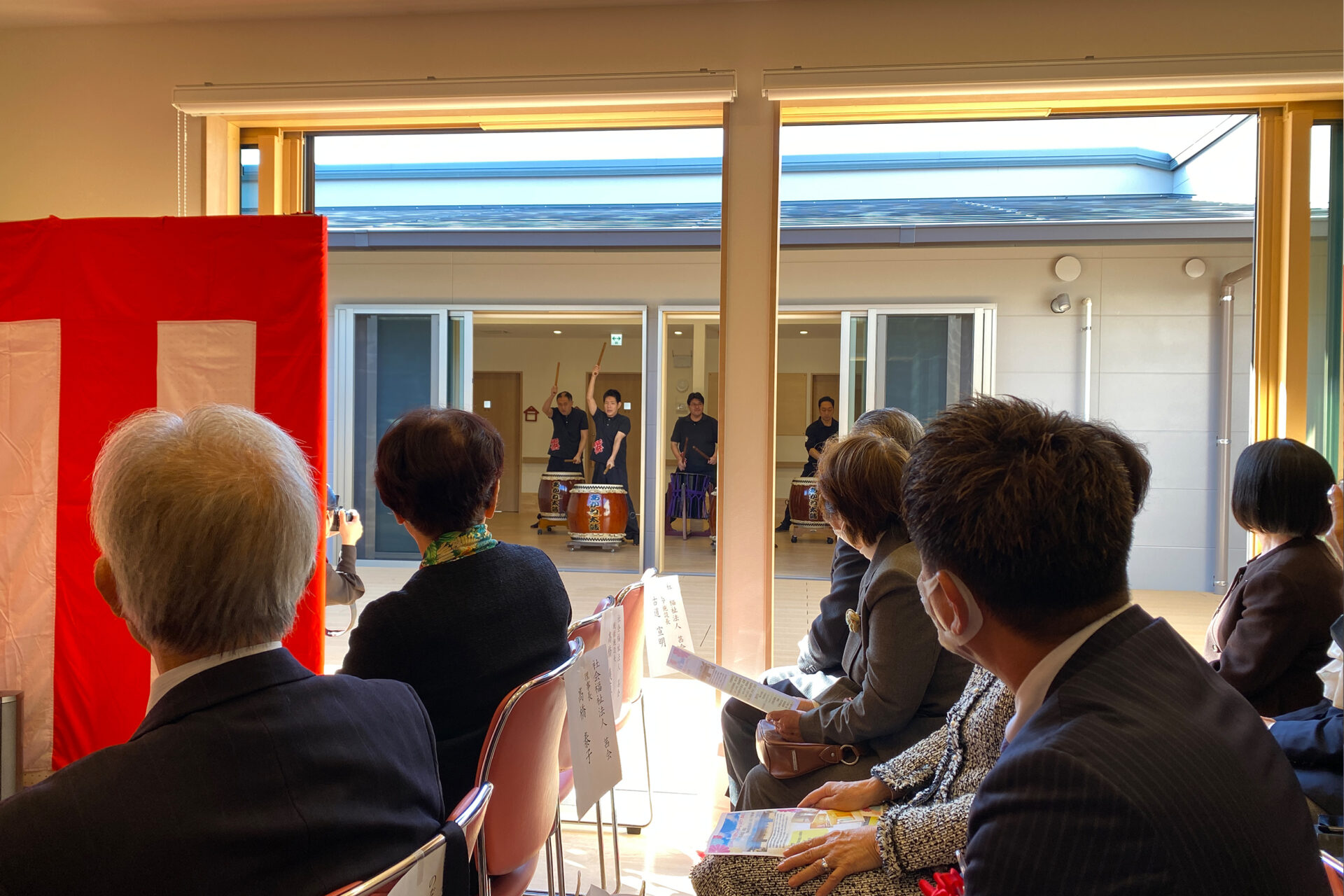 (落成式での利用者さんたちの太鼓演奏。片方のグループ棟からもう片方が良く見える間取りならではの演出)