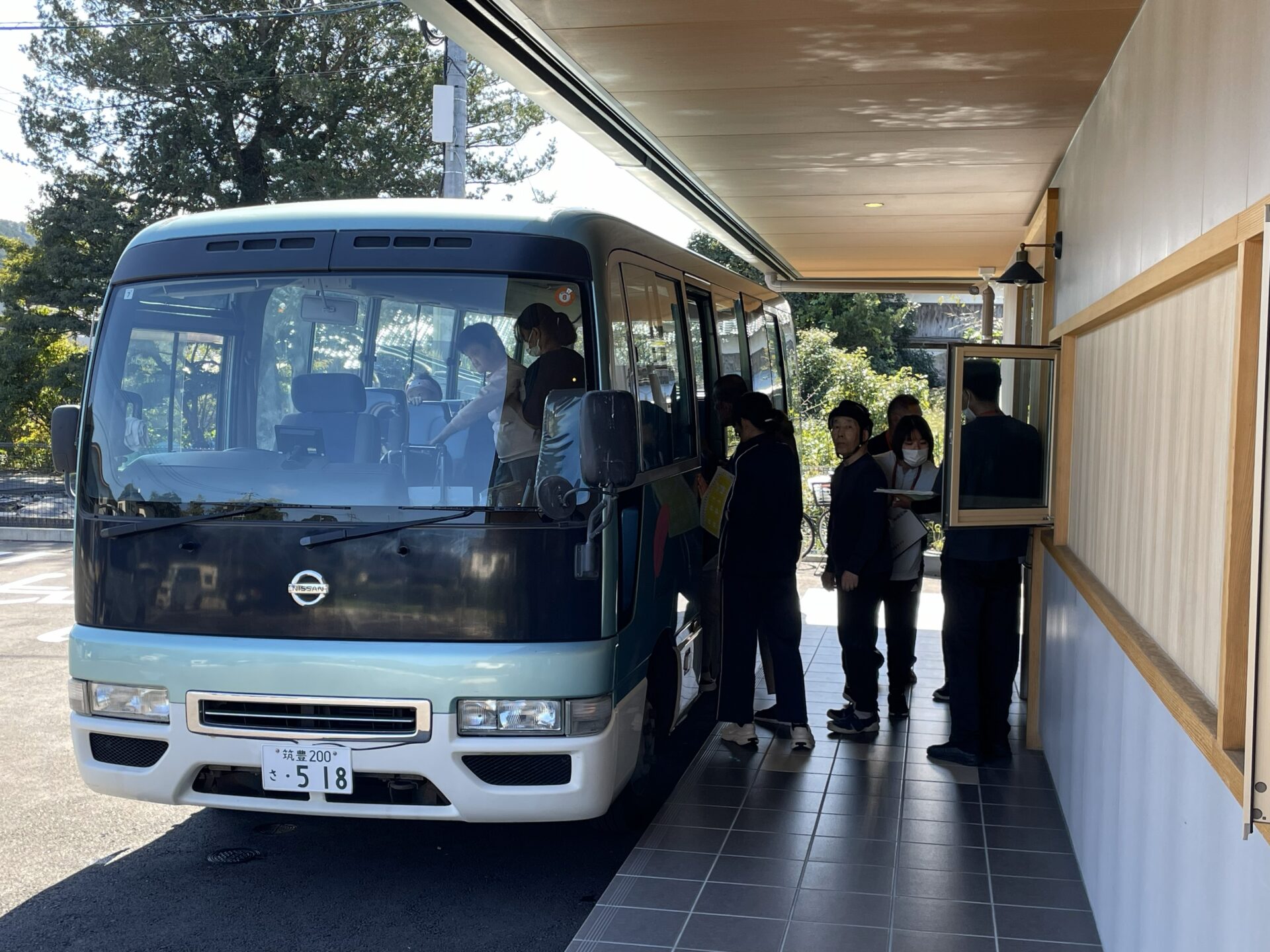 (施設から外出する際に雨にぬれずにバスに乗り込めるようにというご希望で設計した段差の少ないポーチと深い軒)